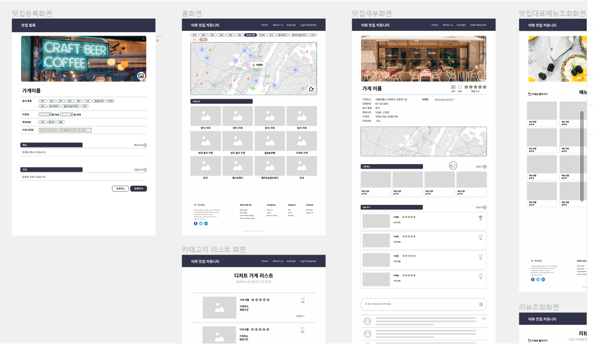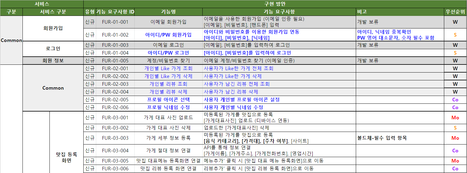 우선 이화 맛집 커뮤니티 웹사이트를 제작하기 위해 전달받은 클라이언트의 개발 요구사항을 정리하였다. 클라이언트의 요구사항을 도표로 만들어 정리하면 어떤 업무를 가장 최우선으로 해야하는 지 알 수 있을 뿐 아니라 각 기능에 따라 정리한 요구사항을 토대로 어떠한 방식으로 분업해야 하는 지 한눈에 파악할 수 있다. 공유 드라이브를 생성하여 각 기능의 요구사항에 맞춰 어떠한 방식으로 작동할 기능인지, 개발 난이도는 어떠한지, 필수 요구사항에 포함되는 것인지 정리하여 요구사항 정의서를 작성하였다.